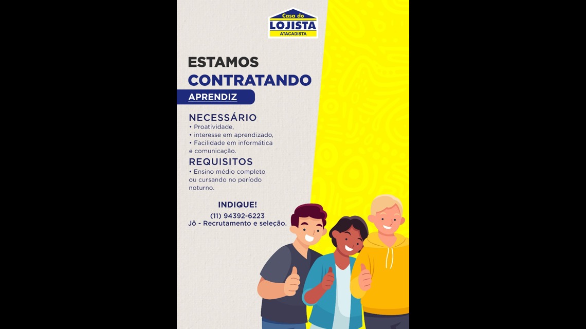Estamos em busca de jovens talentos para atuarem como aprendizes em nossas lojas. Durante o programa, os aprendizes poderão participar de diversos setores, como: área administrativa, embalagem, atendimento ao cliente, apoio às vendas, estoque, recebimento de mercadorias e check-out de produtos.